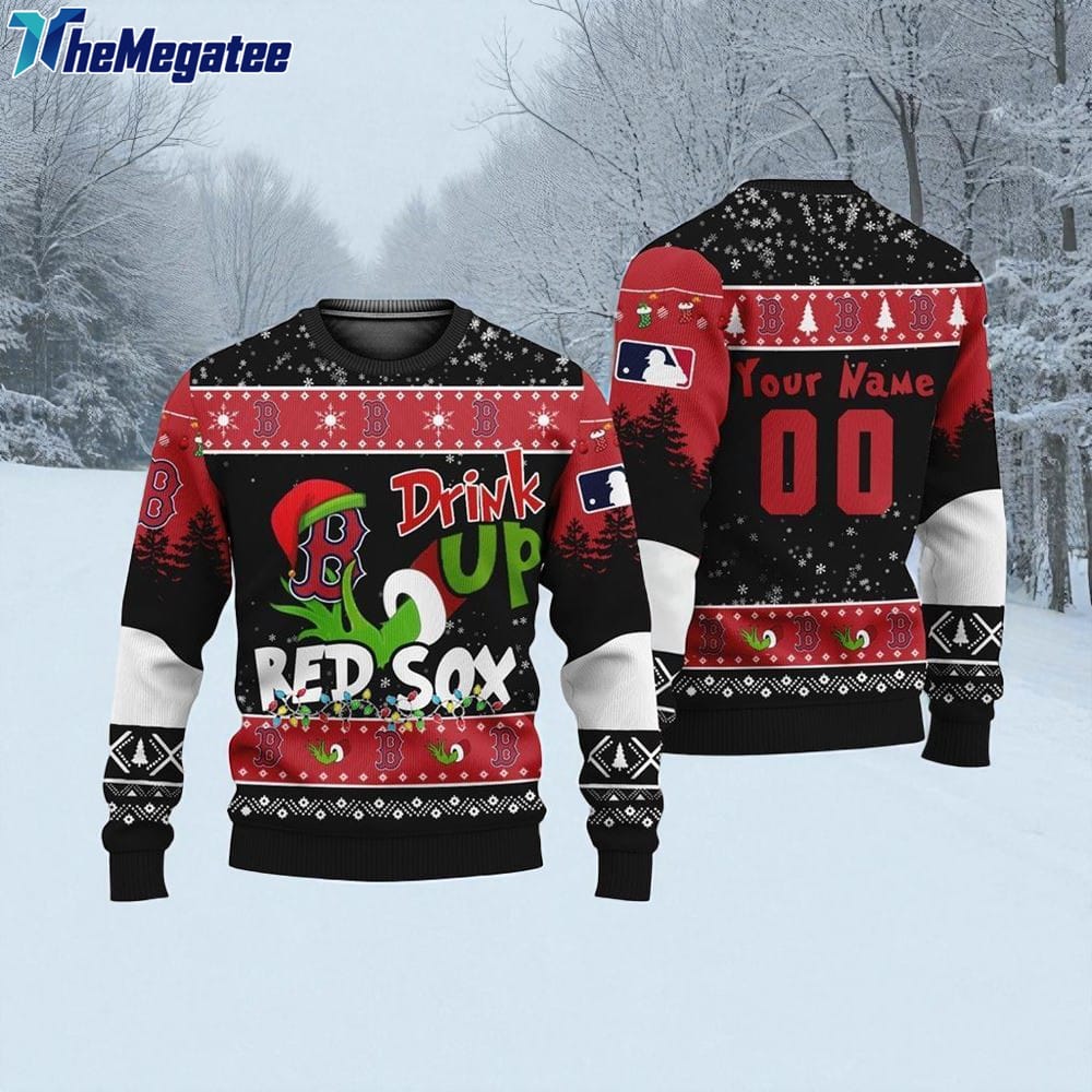 Custom MLB Boston Red Sox Grinch Drink Up Ugly Christmas Sweater Details