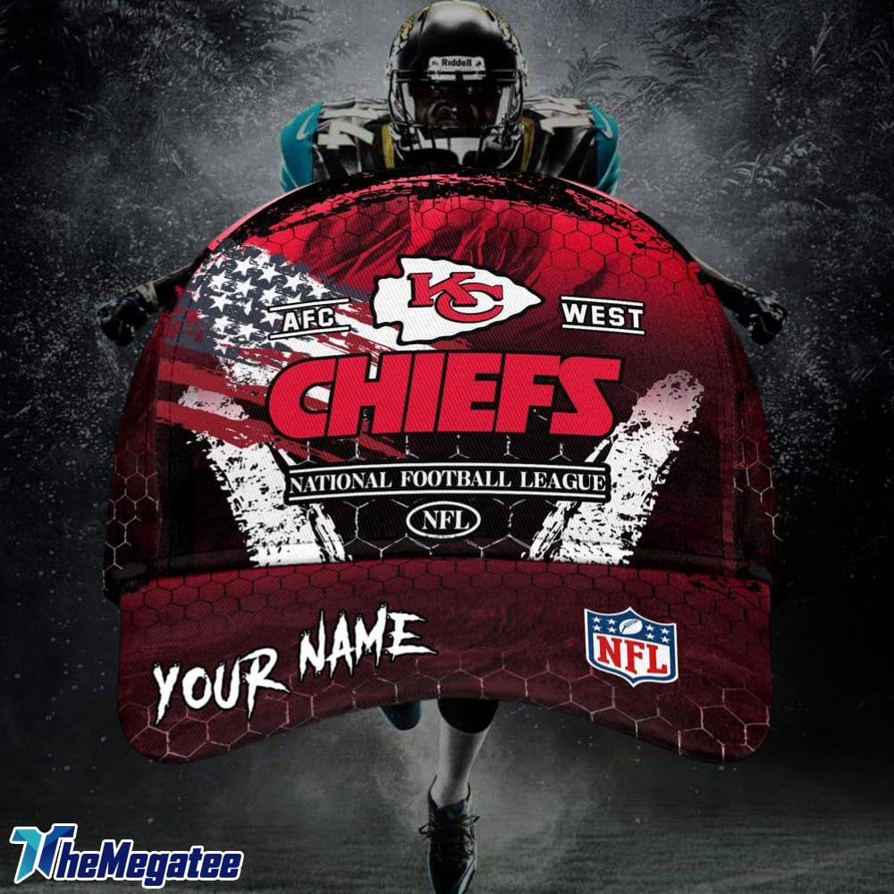 Custom Name Kansas City Chiefs NFL Dark Scratch American Flag Baseball Cap details