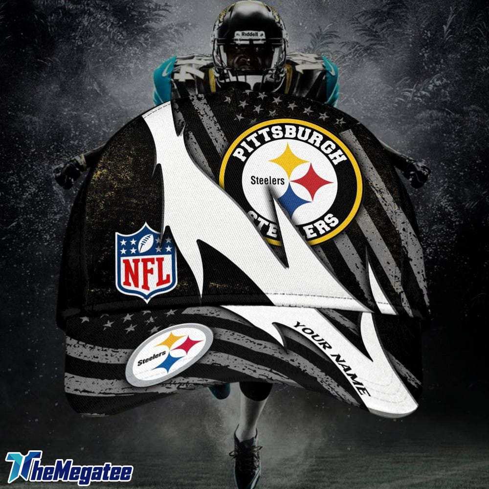 Custom Name Pittsbrugh Steelers NFL Black And White American Flag Fire Baseball Cap details