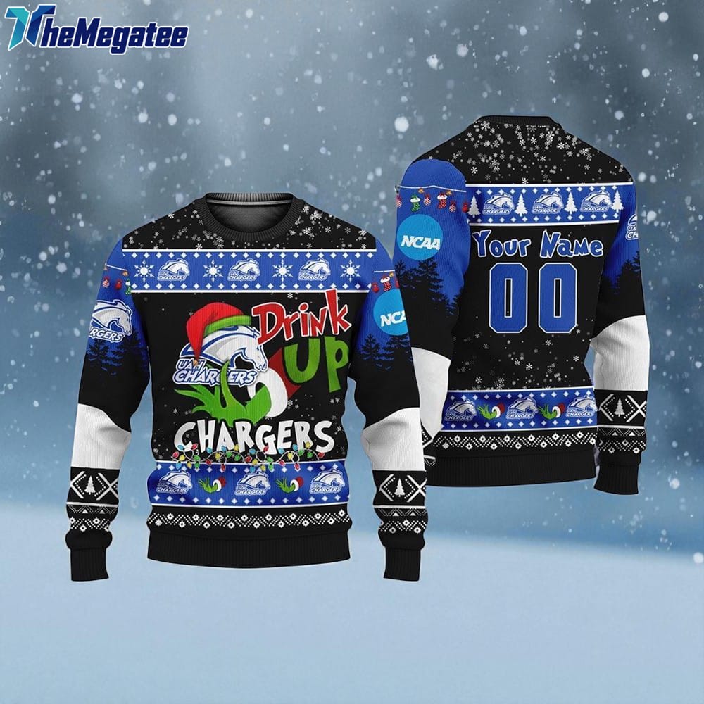 Custom NCAA Alabama Huntsville Chargers Grinch Drink Up Ugly Christmas Sweater Details