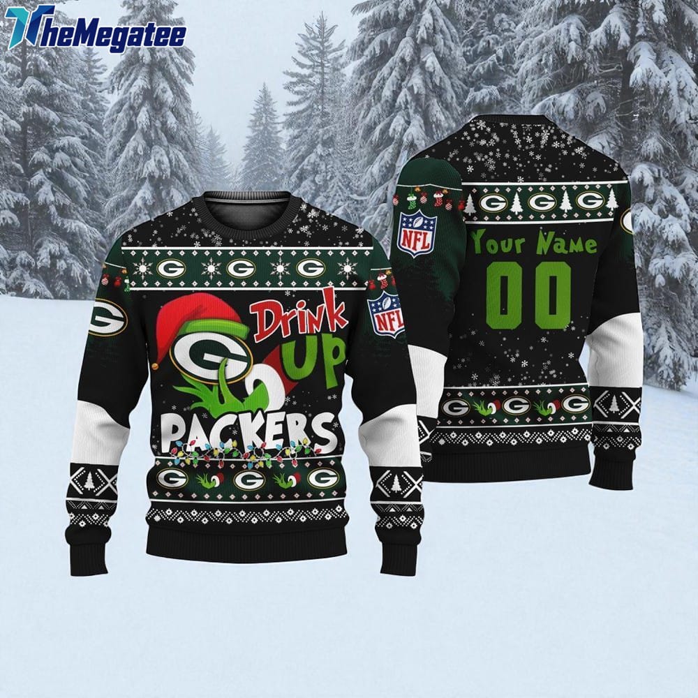 Custom NFL Green Bay Packers Grinch Drink Up Ugly Christmas Sweater Details