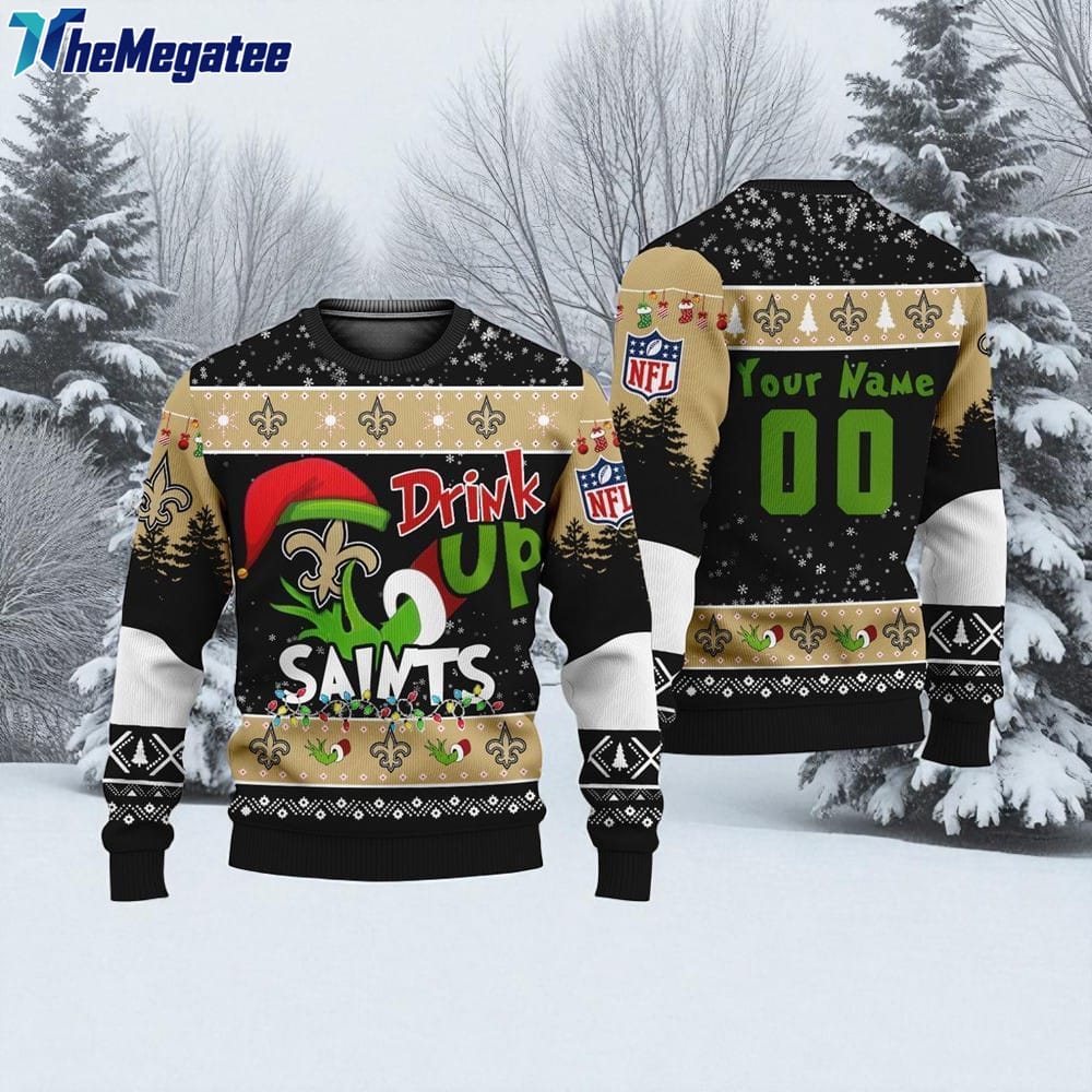 Get ready to show off your festive spirit this holiday season with our exclusive Custom NFL New Orleans Saints Grinch Drink Up Ugly Christmas Sweater! This unique sweater combines two beloved holiday themes – the Grinch and the New Orleans Saints – into one eye-catching design that is sure to impress all your friends and family. Perfect for holiday parties or for lounging at home, this sweater is both stylish and comfortable. Made with high-quality materials, this sweater is built to last for many holiday seasons to come. Don't miss out on the opportunity to wear this one-of-a-kind sweater and spread holiday cheer wherever you go!