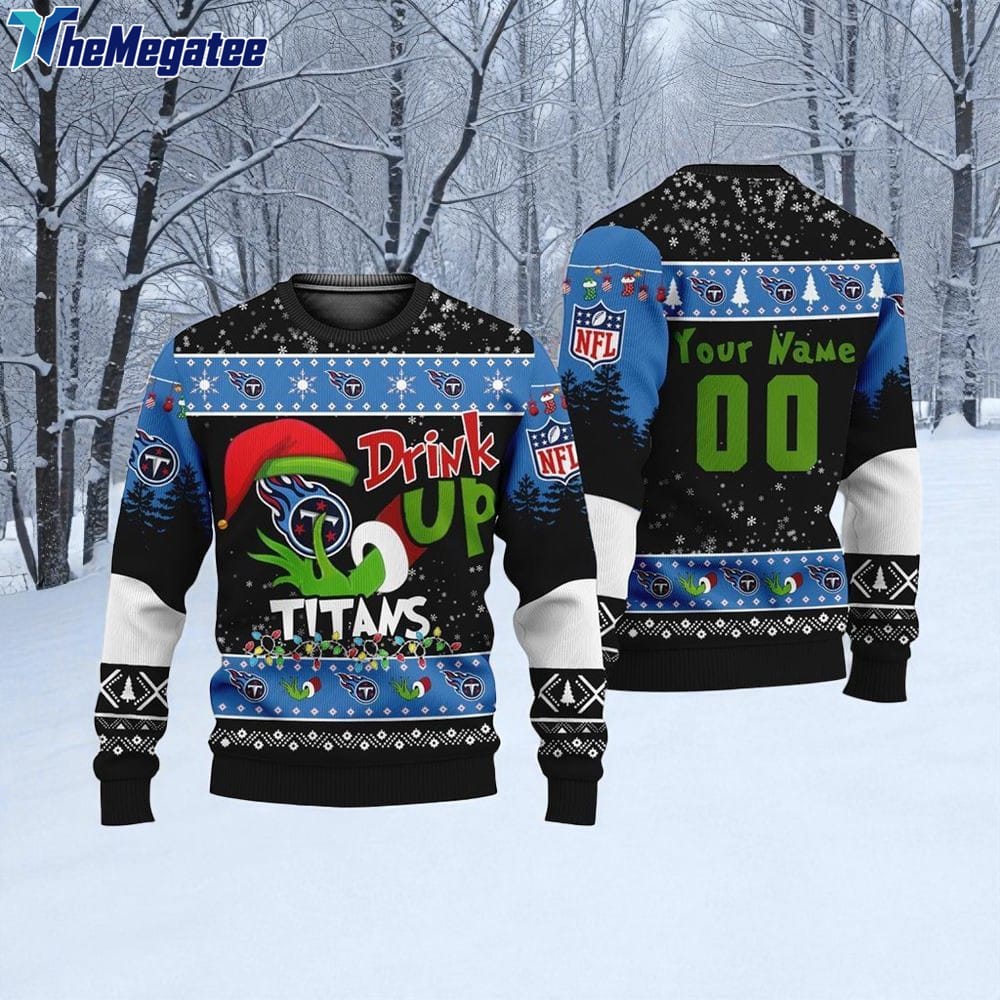 Get ready to show off your team spirit in style this holiday season with our Custom NFL Tennessee Titans Grinch Drink Up Ugly Christmas Sweater! This eye-catching sweater features a unique design that combines the beloved Grinch character with festive Christmas elements, making it the perfect way to stand out at any holiday party or game day event. Whether you're cheering on the Titans or spreading some holiday cheer, this sweater is sure to be a hit with football fans and Christmas lovers alike. Don't miss out on the opportunity to add this one-of-a-kind sweater to your wardrobe and make a statement this holiday season!